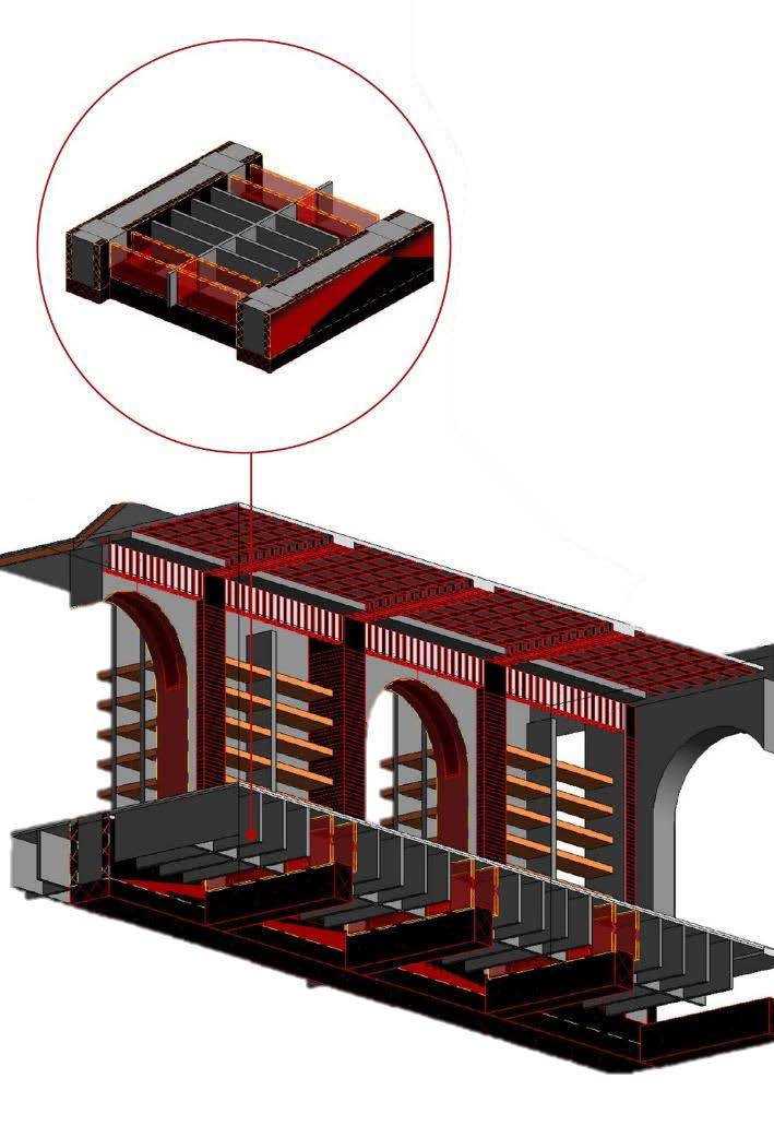 Per le verifiche statiche e sismiche, partendo dall’analisi delle indagini effettuate (carotaggi e prove di compressione) e delle criticità strutturali constatate in situ, è stato realizzato un modello FEM attraverso il software MasterSAP. Sono così stati progettati i rinforzi dei principali elementi strutturali (soletta, travi di fondazione, pilastri, archi e travi) con interventi di sottomurazione, realizzazione di strutture di collegamento in calcestruzzo armato e consolidamento mediante l’applicazione di fibre al carbonio. Con gli interventi si è conseguito un miglioramento sismico, riferito al sisma in zona 3.