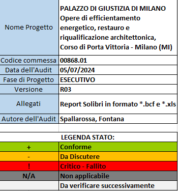 - Svolgimento di cicli di verifica per ciascun progetto effettuate secondo la cadenza delle consegne previste da Capitolato Informativo e successivamente confermata nel PGI. Tali verifiche sono state eseguite sviluppando controlli sui modelli informativi in formato aperto utilizzando le apposite piattaforme di model e code checking, al fine di accertare la conformità di quanto richiesto nei requisiti informativi della Committenza;